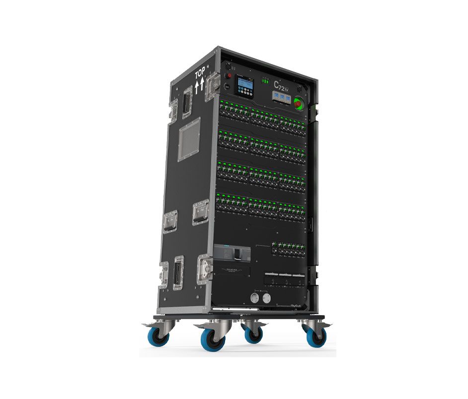 Elle comporte soixante-douze canaux équipés de disjoncteurs hydrauliques-magnétiques de qualité industrielle et d’une détection individuelle très précise du courant résiduel sur chaque sortie. La stabilité thermique, une meilleure tolérance aux fuites à la terre et une meilleure gestion des pics de courants vous permettront de connecter des charges encore plus complexes sur chaque canal. La C72tv vous permet d’adapter vos sorties à toutes les situations grâce à ses boîtiers de sorties modulaires à changement rapide. Passez d’une option de connecteur à l’autre en quelques minutes en fonction des besoins du client ou réparez instantanément un connecteur cassé pendant un spectacle. Les sept sorties auxiliaires monophasées et jusqu’à trois sorties triphasées, qui peuvent être personnalisées selon vos besoins, augmentent encore la flexibilité